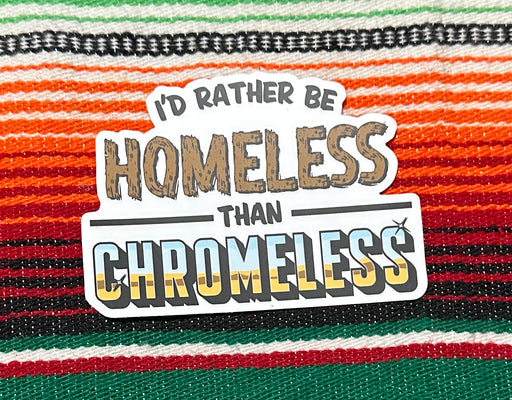 Would you rather be homeless than chromeless? We know we would! Get your sticker today and show your support for all that shines! Size: 4in x ...